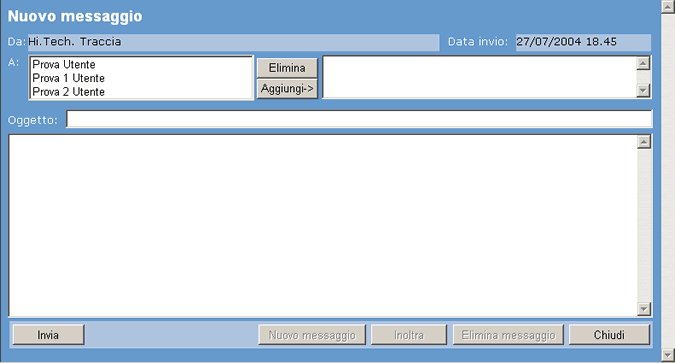Il pulsante Nuovo messaggio consente di creare un nuovo messaggio; il pulsante Elimina messaggio consente di cancellare il messaggio; il pulsante Inoltra consente di inoltrare il messaggio, aprendo una finestra per la creazione di un nuovo messaggio, con lo stesso oggetto e lo stesso testo di quello selezionato. Il pulsante Chiudi consente di chiudere la pagina di dettaglio, senza salvare le eventuali modifiche. I destinatari di un nuovo messaggio vengono selezionati dalla casella a sinistra, dove sono presenti in automatico tutti gli utenti del Registro Regionale, e poi cliccando sul pulsante Aggiungi. La cancellazione di tutta la lista dei destinatari può essere eseguita mediante il click sul pulsante Elimina.